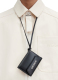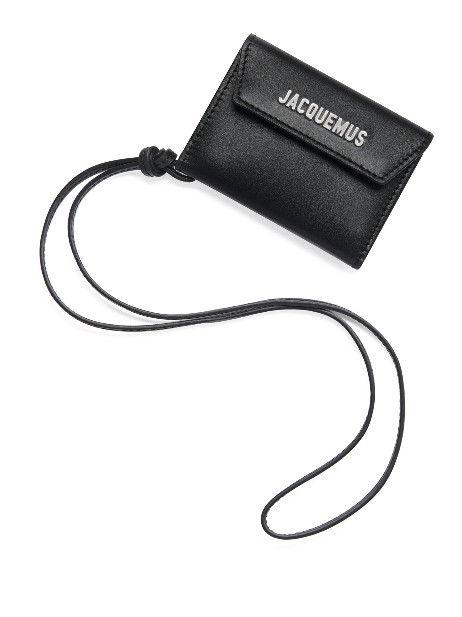 Ανδρικό πορτοφόλι υπογραφής Jacquemus. Διαθέτει τρεις θήκες για κάρτες και μια θήκη με φερμουάρ για νομίσματα και κλείνει με μεταλλικό κούμπωμα. Επίσης διαθέτει αποσπώμενο δερμάτινο λουρί και ,εταλλικό λογότυπο του οίκου.