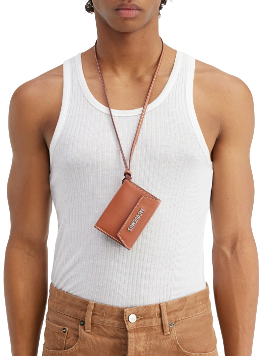 Ανδρικό πορτοφόλι υπογραφής Jacquemus. Διαθέτει τρεις θήκες για κάρτες και μια θήκη με φερμουάρ για νομίσματα και κλείνει με μεταλλικό κούμπωμα. Επίσης διαθέτει αποσπώμενο δερμάτινο λουρί και ,εταλλικό λογότυπο του οίκου.