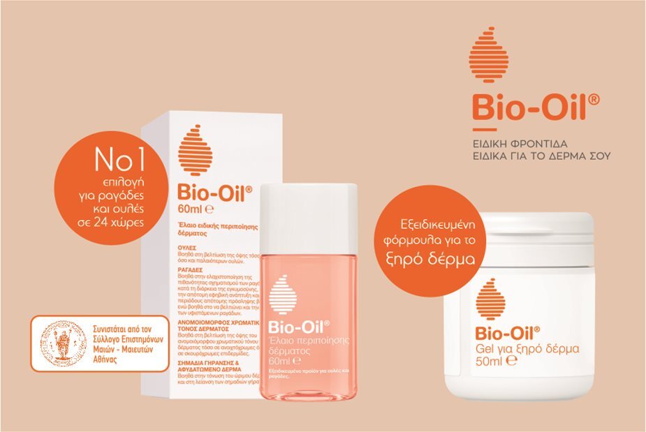 Το Bio‑Oil Skincare Oil, το Νο 1 σε πωλήσεις προϊόν για ουλές και ραγάδες σε 24 χώρες, είναι ένα ειδικό έλαιο περιποίησης του δέρματος, κατάλληλο για την πρόληψη και ανάπλαση ενάντια σε ουλές, ραγάδες και ανομοιόμορφο χρωματικό τόνο δέρματος. Κατέχει σσφαλές τοξικολογικό προφίλ για χρήση από εγκύους και συνιστάται από τον Σύλλογο Επιστημόνων Μαιών-Μαιευτών Αθήνας, για την αποτελεσματική & ασφαλή χρήση του ενάντια στην εμφάνιση ραγάδων κατά τη διάρκεια της εγκυμοσύνης.