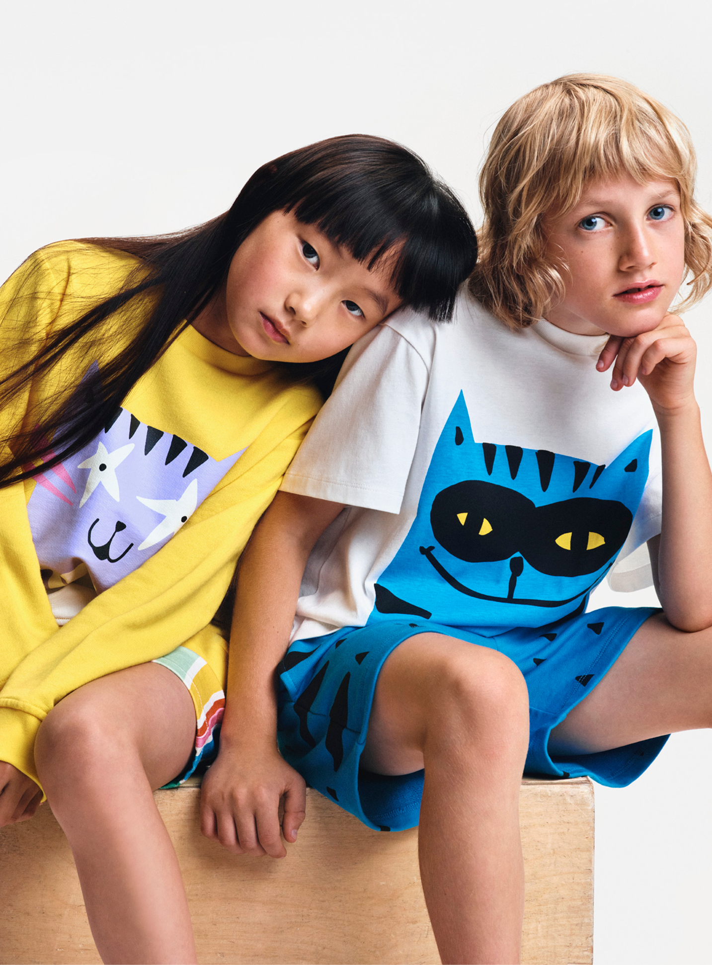 Για τα αγόρια η συλλογή εμπνέεται από τον κόσμο της μαγείας με μοτίβα όπως μαγικά καπέλα με κουνέλια, ραβδιά και δεντρόσπιτα. Τα skater boy vibes εκφράζονται μέσα από skateboard prints και ζωντανές αποχρώσεις (πράσινο, μπλε, πορτοκαλί). Το cheeky “Catitude” θέμα φέρνει σκανταλιάρικες γατούλες σε σετ, ενώ κολεγιακά Stella λογότυπα και varsity επιρροές δίνουν αθλητικό χαρακτήρα σε φούτερ, t-shirts και πουκάμισα.