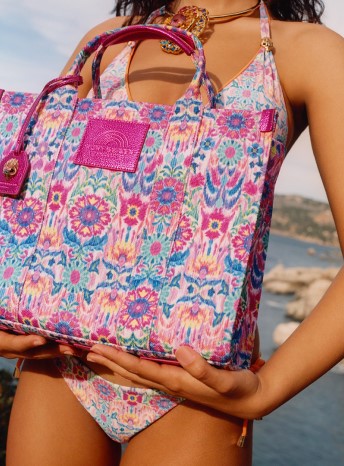 Το πρώτο από τα αξεσουάρ στο οποίο αναφερόμαστε πάντα, είναι η τσάντα. Η πιο βολική επιλογή είναι σίγουρα μία που μπορείτε να κρατήσετε σε πολλές περιστάσεις και έτσι από τη συλλογή Kurt Geiger X Matthew Williamson ξεχωρίζει αυτή η τσάντα που μπορείτε να έχετε μαζί σας τόσο στην πόλη, όσο και στις διακοπές σας. Διαθέτει αποσπώμενο λουράκι και έτσι μπορείτε να τη φορέσετε με πολλούς τρόπους. Σειρά έχει μια τσάντα που «μυρίζει» καλοκαίρι, καθώς είναι η πιο summer appropriate εκδοχή της iconic Kensington του Kurt Geiger. Είναι φτιαγμένη από ψάθα και shiny δέρμα και είναι το τέλειο αξεσουάρ για τα αέρινα καλοκαιρινά σας φορέματα και όχι μόνο.