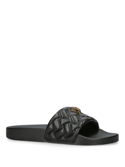 Γυναικείες παντόφλες του οίκου Kurt Geiger. Το λουράκι είναι καπιτονέ και καλύπτεται με αντικέ ορειχάλκινη κεφαλή Eagle. Η σόλα είναι κατασκευασμένη από καουτσούκ και έχουν κανονική γραμμή.