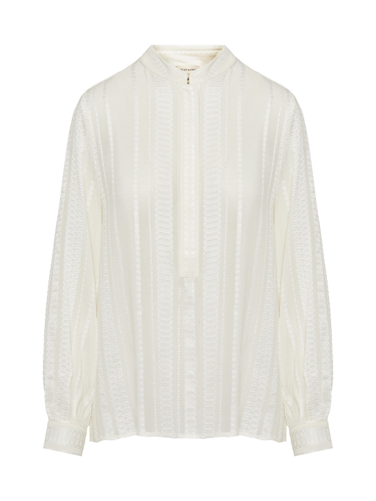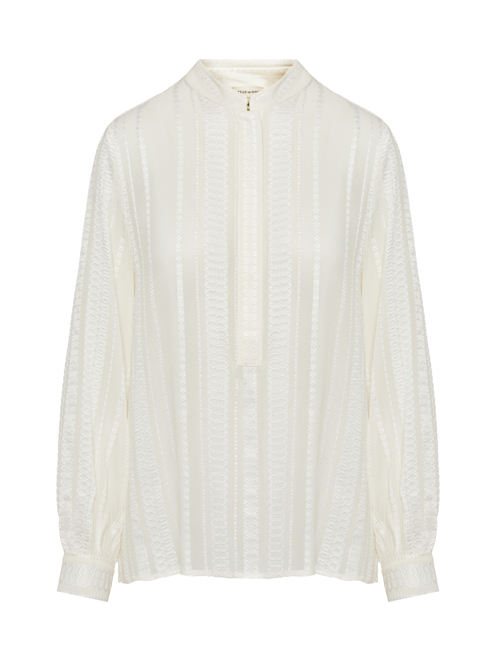 Γυναικεία μεταξωτή μπλούζα από τον οίκο Zeus + Dione. Είναι σε άνετη γραμμή και διαθέτει μεταξωτές ζακάρ ρίγες.