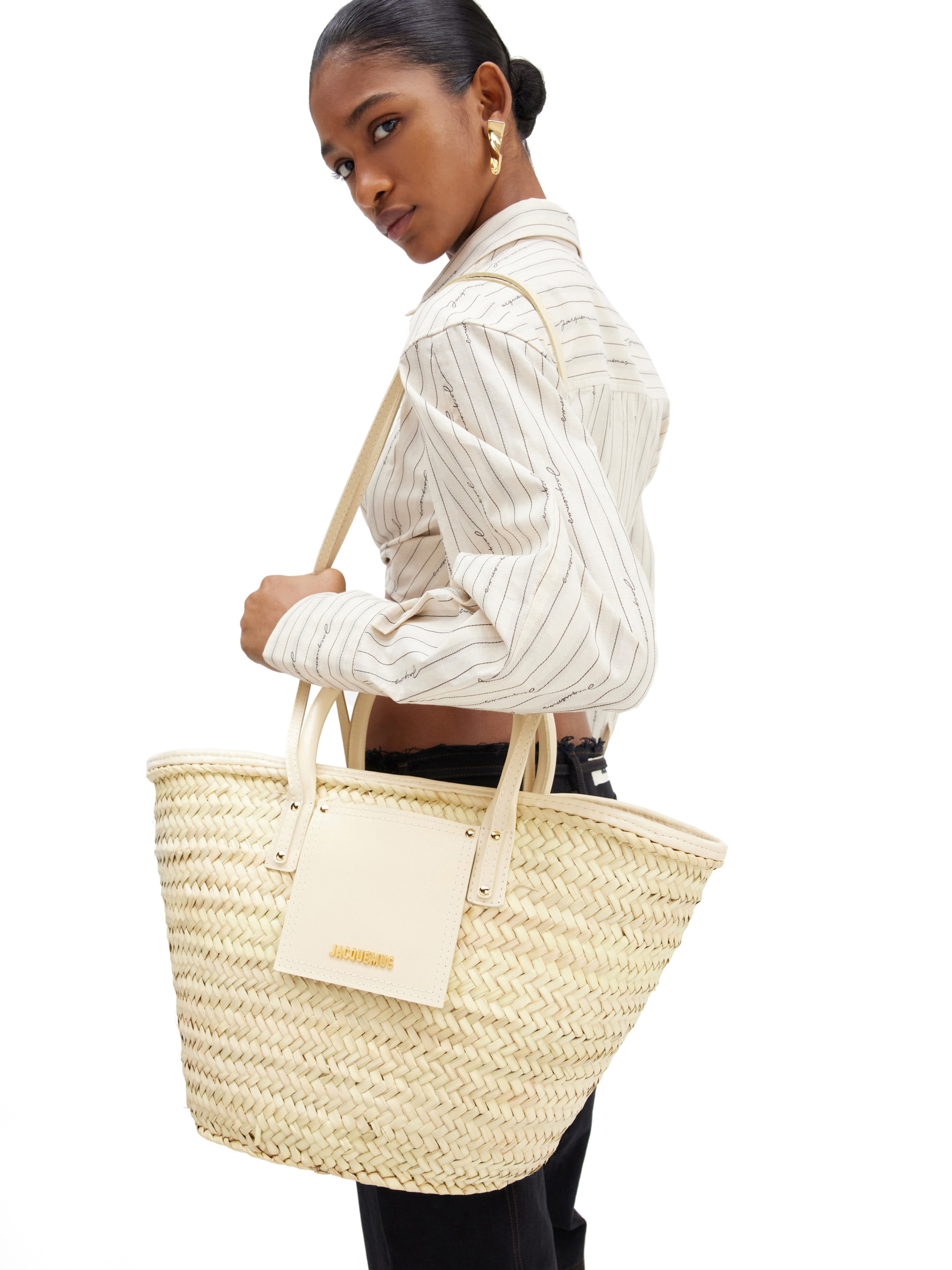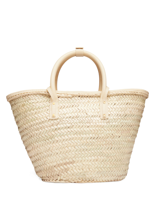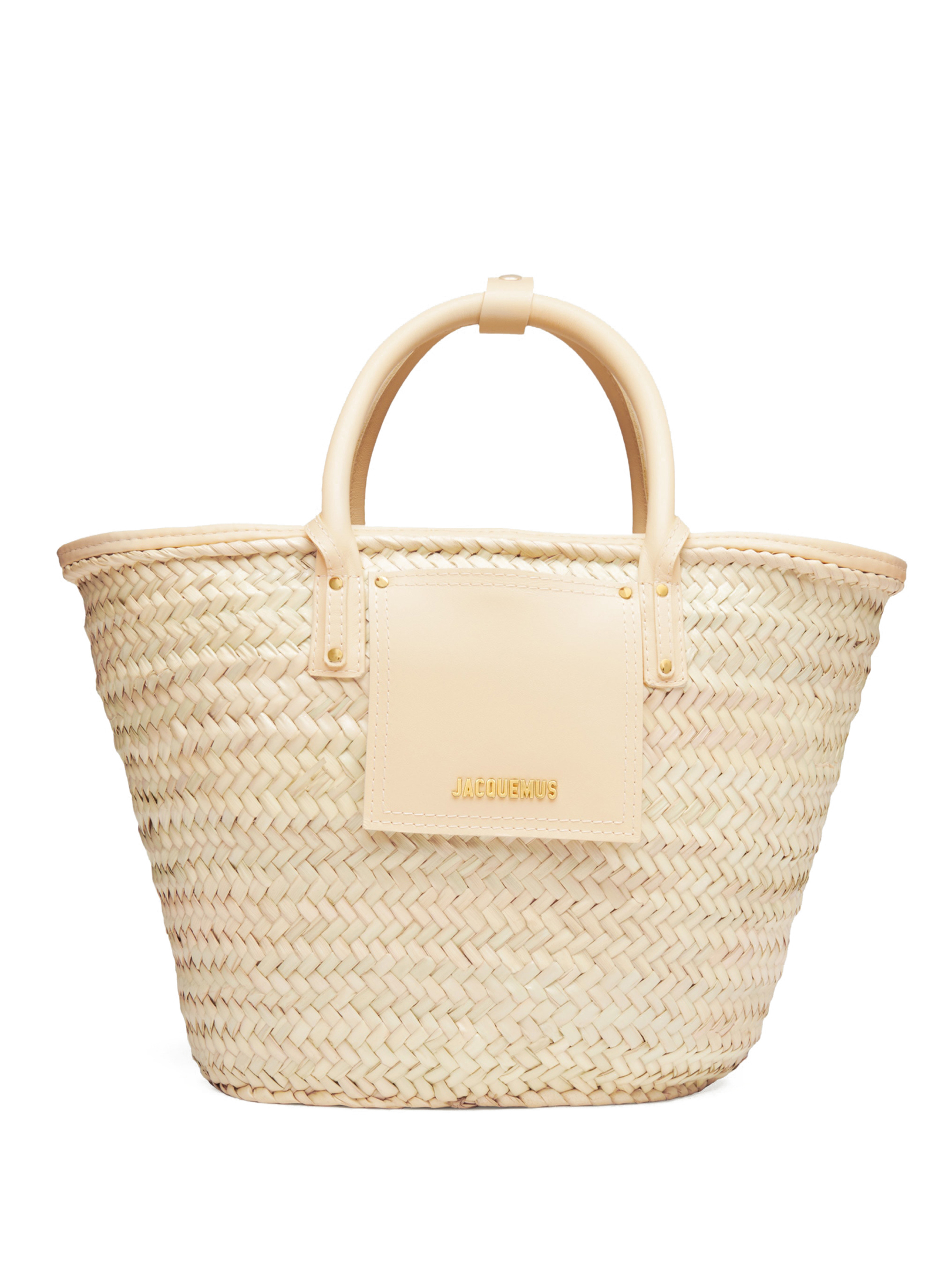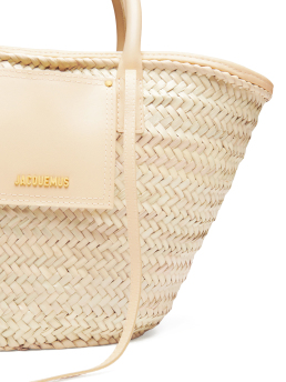 Jacquemus ψάθινη τσάντα χειρός, διακοσμημένη με δερμάτινες λεπτομέρειες. Διαθέτει διπλή χειρολαβή στο άνω μέρος, ιμάντες ώμου και εξωτερική τσέπη. Έχει μεταλλικό κλείσιμο και μεταλλικό λογότυπο.