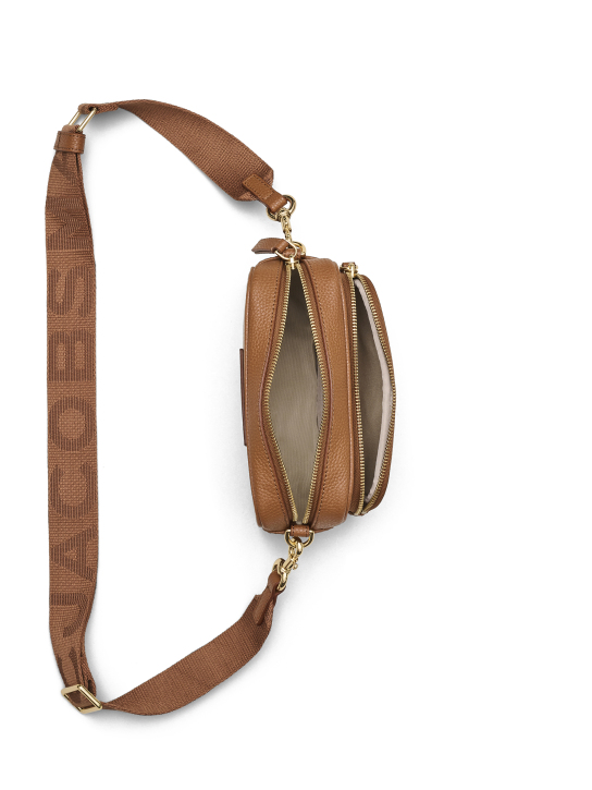 Δερμάτινη γυναικεία τσάντα χιαστί του οίκου Marc Jacobs. Διαθέτει δυο βασικές θήκες που κλείνουν με φερμουάρ και αποσπώμενο ρυθμιζόμενο ιμάντα με το λογότυπο του brand. Επίσης διαθέτει μια επιπλέον θήκη στο πίσω μέρος.