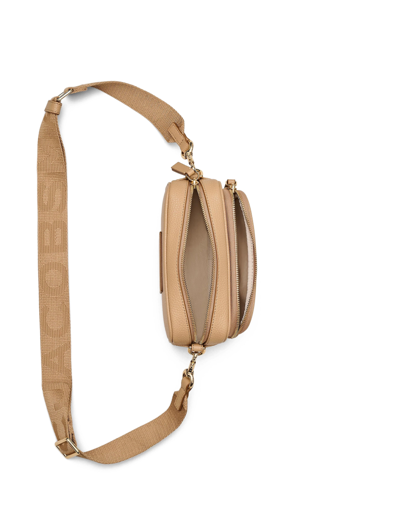 Δερμάτινη γυναικεία τσάντα χιαστί του οίκου Marc Jacobs. Διαθέτει δυο βασικές θήκες που κλείνουν με φερμουάρ και αποσπώμενο ρυθμιζόμενο ιμάντα με το λογότυπο του brand. Επίσης διαθέτει μια επιπλέον θήκη στο πίσω μέρος.