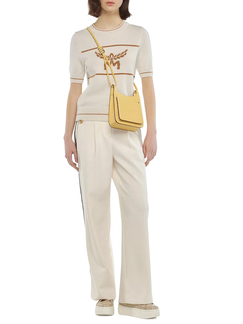Γυναικεία δερμάτινη τσάντα ώμου υπογραφής MCM. Διαθέτει ρυθμιζόμενο ιμάντα ώμου και διακοσμείται με το μονόγραμμα του οίκου μπροστά.