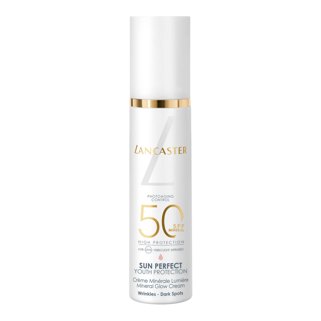 Αντιστρέφοντας τα ορατά σημάδια γήρανσης που προκαλούνται από τη φωτογήρανση, η νέα Sun Perfect Mineral Glow Cream SPF50 της Lancaster διαθέτει την ευρύτερη αντηλιακή προστασία μας, κατάλληλη για ευαίσθητες ή αντιδραστικές επιδερμίδες, με 100% mineral φίλτρα. Αυτή η καθημερινή ροζ mineral κρέμα προάγει μια ομοιόμορφη, τέλεια και νεανική επιδερμίδα με tone-up αποτέλεσμα. Η τεχνολογία Full Light TechnologyTM, προσφέρει 10 φορές ευρύτερη τεχνολογία ηλιακού φάσματος*, ενώ η τεχνολογία αντιγήρανσης συμβάλλει στη μείωση των ρυτίδων, των λεπτών γραμμών και των σκούρων κηλίδων και αποτρέπει την εμφάνιση νέων. Η ανακουφιστική υφή με τη ροζ απόχρωση αναμειγνύεται άψογα, αφήνοντας μια φωτεινή επιδερμίδα. Λειτουργεί επίσης τέλεια ως βάση μακιγιάζ. *Στοχεύοντας στο πλήρες ηλιακό φάσμα έναντι της προστασίας UVB & UVA μόνο. Κανένα αντηλιακό προϊόν δεν μπορεί να παρέχει πλήρη προστασία από τις ακτίνες του ήλιου. Η υπερβολική έκθεση στον ήλιο αποτελεί σοβαρή απειλή για την υγεία.