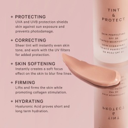 Skin Tint & Protect SPF30 30ml. Αυτή η ελαφριά ενυδατική με χρώμα και SPF30, συνδυάζει Υαλουρονικό Οξύ υψηλού μοριακού βάρους, έλαιο Kahai και ενθυλακωμένη Βιταμίνη C που ενισχύει τα επίπεδα υγρασίας και υποστηρίζει την κυτταρική ανάπτυξη. Η ευρέος φάσματος κάλυψη από UVA και UVB προστατεύει από την φωτογήρανση και τις περιβαλλοντικές επιθέσεις ενώ το χρώμα διορθώνει τις ατέλειες της επιδερμίδας και της χαρίζει νεανική φωτεινότητα. Η επιδερμίδα είναι προστατευμένη, φωτεινή, με λάμψη υγείας όλο το χρόνο.