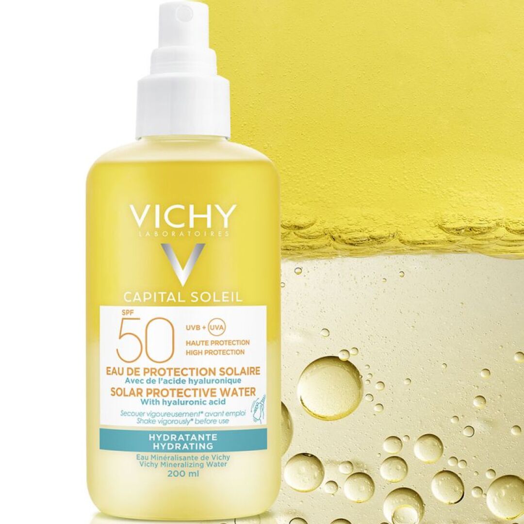 Αντηλιακό Νερό Υψηλής Προστασίας από τον ήλιο για ενυδάτωση με υαλουρονικό οξύ και Ιαματικό Μεταλλικό Νερό της Vichy. Ιδανικό για Πρόσωπο και Σώμα.