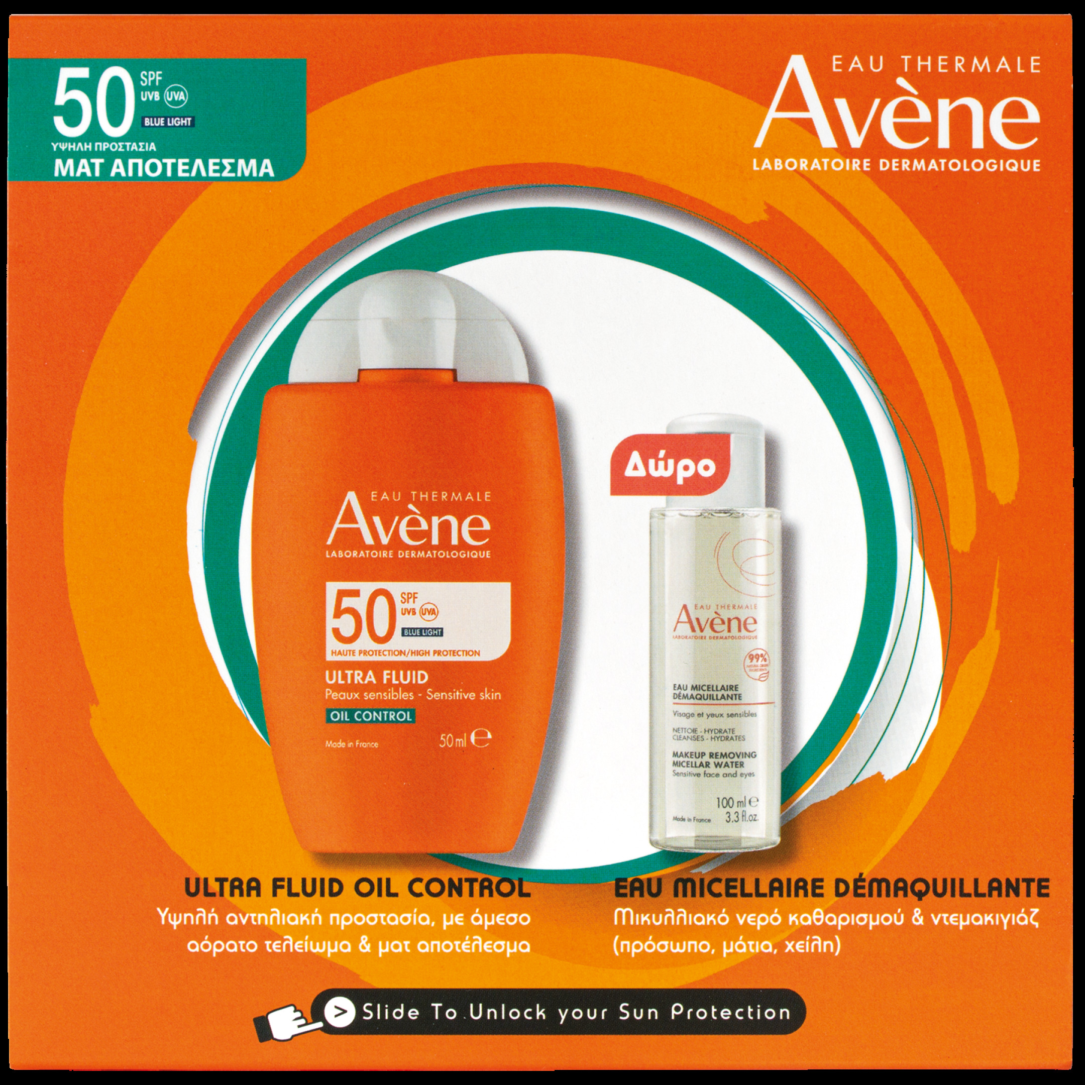 Ultra Fluid Oil Control SPF 50, 50ml: Προσφέρει υψηλή καθημερινή προστασία από UVB, UVA και HEV μπλε φως, για την πρόληψη της φωτογήρανσης.Eau Micellaire Demaquillante, 100ml: Αυτό το νερό καθαρισμού & ντεμακιγιάζ καθαρίζει (ακόμη και τα σωματίδια ρύπανσης*), ενυδατώνει** και καταπραΰνει το ευαίσθητο πρόσωπο και τα μάτια σε ένα εύκολο βήμα. Περιέχει 99% φυσικά συστατικά και κανένα ζωικής προέλευσης. Αφήνει το δέρμα καθαρό, απαλό και ανακουφισμένο, προσφέροντας του μια αίσθηση άνεσης. Αυτό το διακριτικά αρωματισμένο αναζωογονητικό νερό καθημερινής χρήσης αφαιρεί το μακιγιάζ και χαρίζει απαλότητα με ένα απλό, γρήγορο βήμα. Ενισχύει την ενυδάτωση και διατηρεί τη φυσική ισορροπία του δέρματος χάρη στο συνδυασμό Γλυκερίνης και Τρεχαλόζης και την υψηλή συγκέντρωση σε Ιαματικό Νερό της Avène με καταπραϋντικές ιδιότητες. Η σύνθεσή του περιέχει ελάχιστα συστατικά στη σωστή δόση, ώστε να διασφαλίζεται η αποτελεσματικότητα και η ανοχή***.