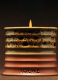 Φτιαγμένο από φυσικό κερί με ένα βαμβακερό φυτίλι, φιλοξενείται σε ένα επισμαλτωμένο, κίτρινο- καφέ περιέκτη από τερρακόττα, με βάση που φέρει ανάγλυφη σφραγίδα.