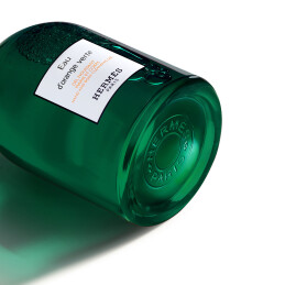 Οι καμπύλες γραμμές του μπουκαλιού στολίζονται με ένα βαθύ πράσινο χρώμα, εμβληματικό της cologne Eau d’orange verte, και με δυο καρφιά σέλας: ένα χαραγμένο στην βάση, και ένα επάνω στην αντλία.