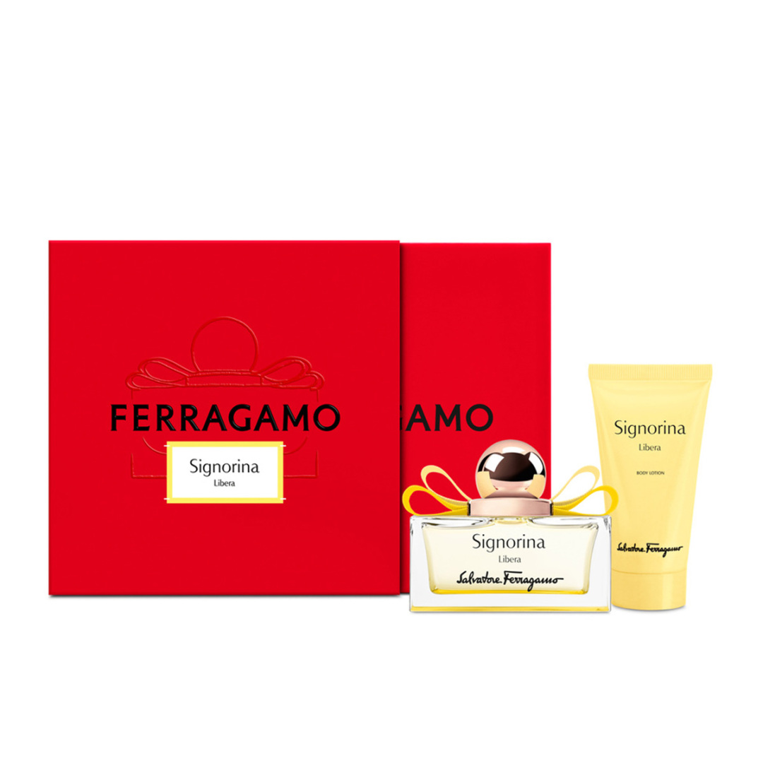 Signorina Libera Eau De Toilette & Body Lotion Set. Αυτές τις γιορτές, ανακαλύψτε το λαμπερό άρωμα του οίκου Ferragamo - Signorina Libera Eau de Parfum. Δυναμικό και τολμηρό, αυτό το floral musky άρωμα αναδεικνύει τις φωτεινές νότες από μανταρίνι, ylang ylang και γάλα καρύδας. Προσφέρετε το δώρο της ελευθερίας, τυλιγμένο με το νέο εμβληματικό Ferragamo σε κόκκινο χρώμα. Το σετ περιλαμβάνει το άρωμα Signorina Libera Eau De Toilette 50ml & Body Lotion 50ml.