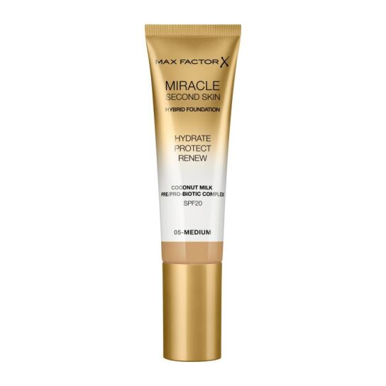 Miracle Second Skin Hybrid Foundation στην απόχρωση Medium Tan της Max Factor. Hybrid Foundation με ελαφριά κάλυψη και κλινικά αποδεδειγμένα συστατικά περιποίησης του δέρματος. Ενυδατώνει, προστατεύει και ανανεώνει την επιδερμίδα. Με γάλα και έλαια καρύδας για ενυδάτωση, φυσικά αντηλιακά SPF 20 UVA & UVB καθώς και προβιοτικό και πρεβιοτικό σύμπλεγμα που ενισχύει τη φυσική άμυνα της επιδερμίδας.