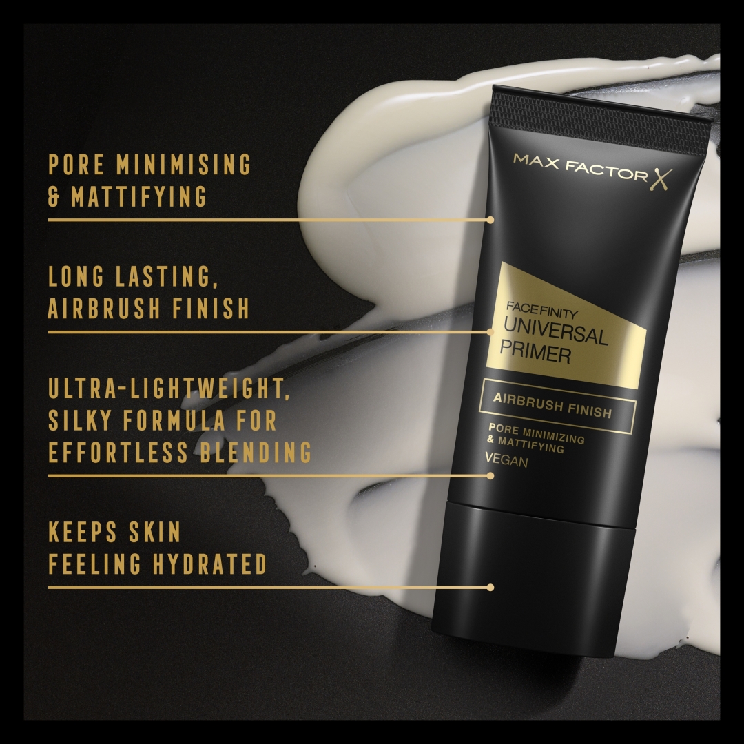 Facefinity Universal Primer στην απόχρωση 001. Το Facefinity Universal Primer με την ελαφριά ματ σύνθεση με αντιοξειδωτική δράση που προστατεύει και θρέφει την επιδερμίδα ενισχύοντας τη διάρκεια του μακιγιάζ. Το καινοτόμο Primer της Max Factor αποτελεί την ιδανική επιλογή για ένα αψεγάδιαστο αποτέλεσμα, καθώς ελαχιστοποιεί τους πόρους και λειαίνει τις ατέλειες. Η vegan φόρμουλά του προσφέρει μεταξένια και πολύ ανάλαφρη αίσθηση ενυδάτωσης και προστασίας της επιδερμίδας.