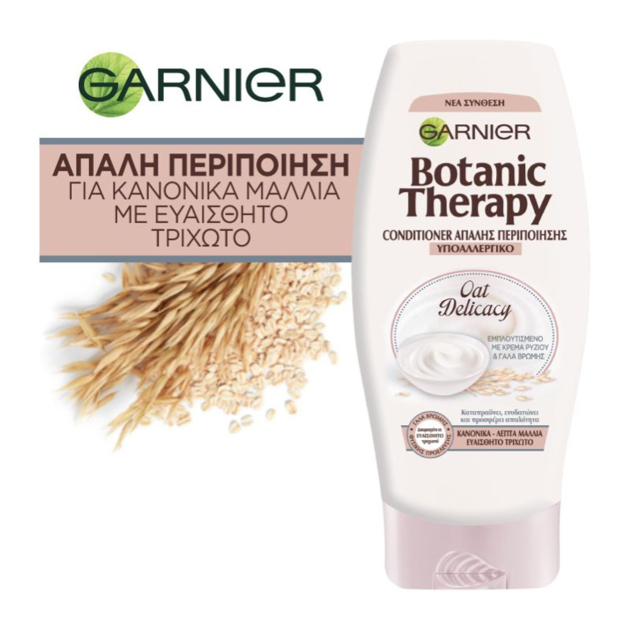 Botanic Therapy Oat Milk Delicacy Conditioner 200ml. Εύκολα ξεμπερδεμένα και εντατικά ενυδατωμένα, μέρα με τη μέρα, τα μαλλιά γίνονται λαμπερά, απίστευτα απαλά και ελαστικά, πραγματικά ευκολοχτένιστα. Λάμπουν από ομορφιά. Η κρεμώδης και απαλή υφή του, που έχει ξεχωριστό άρωμα, ξεμπερδεύει αμέσως και ξεπλένεται εύκολα, χωρίς να βαραίνει τα μαλλιά.