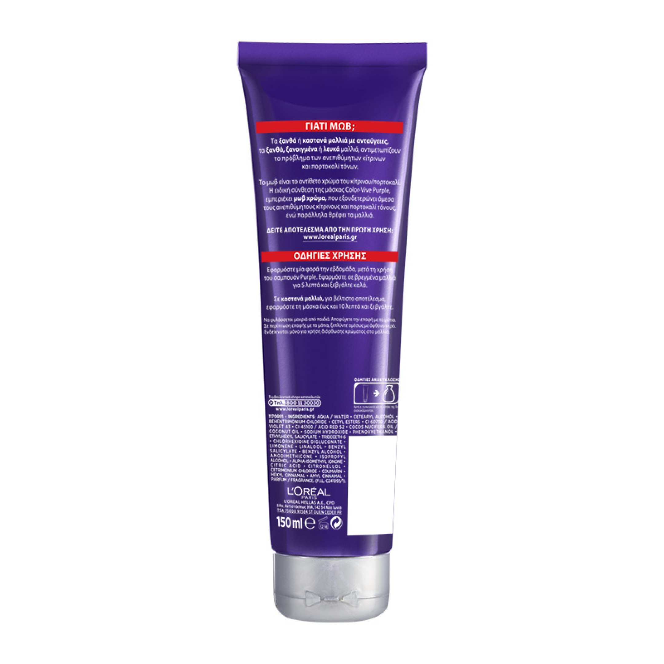 Τα ξανθά ή καστανά μαλλιά με ανταύγειες, τα ξανθά, ξανοιγμένα ή λευκά μαλλιά, αντιμετωπίζουν το πρόβλημα των ανεπιθύμητων κίτρινων και πορτοκαλί τόνων με το Elvive Color Vive Purple Mask 150ml.