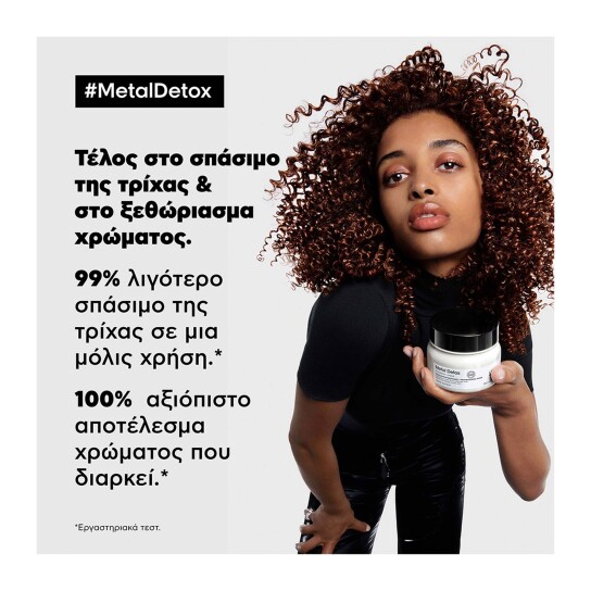 Επαγγελματική σύνθεση 250ml για την προστασία από τα μεταλλικά στοιχεία. Εμπλουτισμένη με Γλυκοαμίνη, η Serie Expert Metal Detox Μάσκα απομακρύνει τα μετάλλικα στοιχεία στο εσωτερικό της τρίχας και αποτοξινώνει τα μαλλιά, προσφέροντας τους ελαστικότητα, ανθεκτικότητα, έως και 87% λιγότερο σπάσιμο, 100% αξιόπιστο αποτέλεσμα χρώματος και λάμψη. Για καλύτερα αποτελέσματα, χρησιμοποιήστε τη μετά το Σαμπουάν Metal Detox