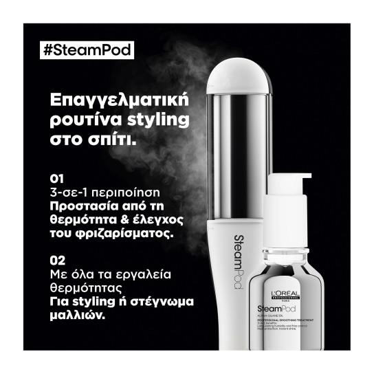 Η επαγγελματική SteamPod Περιποίηση Λείανσης είναι σχεδιασμένη χωρίς νερό και εμπλουτισμένη με άλφα-σιλάνη, ένα ενεργό συστατικό περιποίησης που προστατεύει από τη θερμότητα και τις συνθήκες υγρασίας.