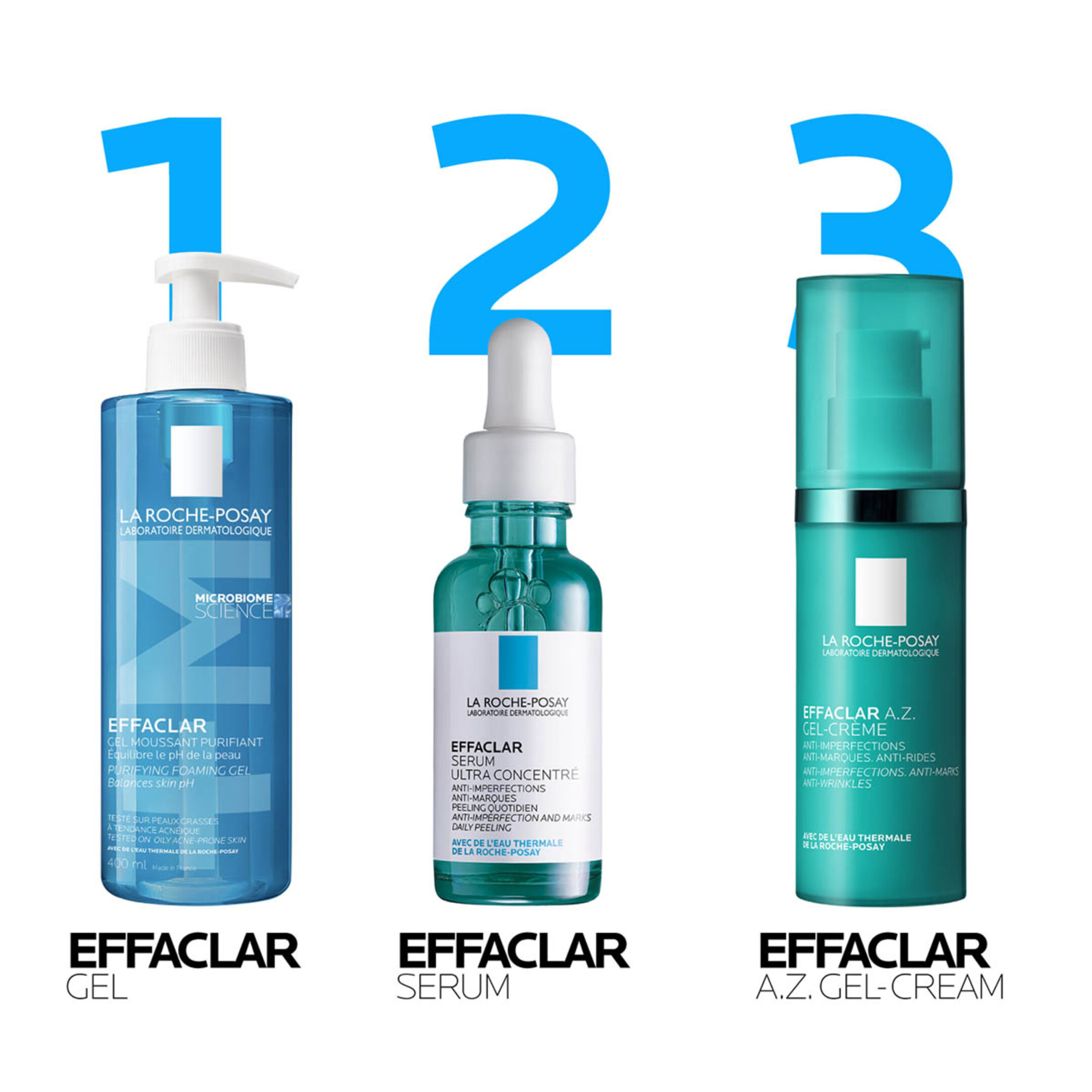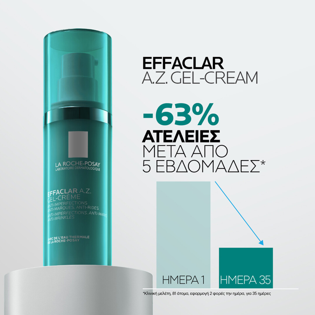 To νέο Effaclar A.Z. Gel Cream 30ml της La Roche-Posay είναι κατά των ατελειών, των σημαδιών και της επανεμφάνισης. Μοναδική σύνθεση ενισχυμένη με τρία οξέα που συστήνονται από δερματολόγους: 10% Αζελαϊκό + Σαλικυλικό + Υαλουρονικό Οξύ για διπλή δράση κατά των ατελειών και της γήρανσης. Διορθώνει τις επίμονες ατέλειες σε 7 ημέρες* και τα σημάδια γήρανσης.
