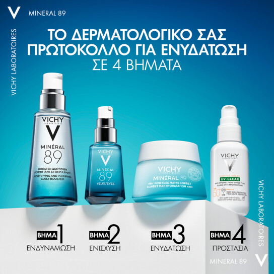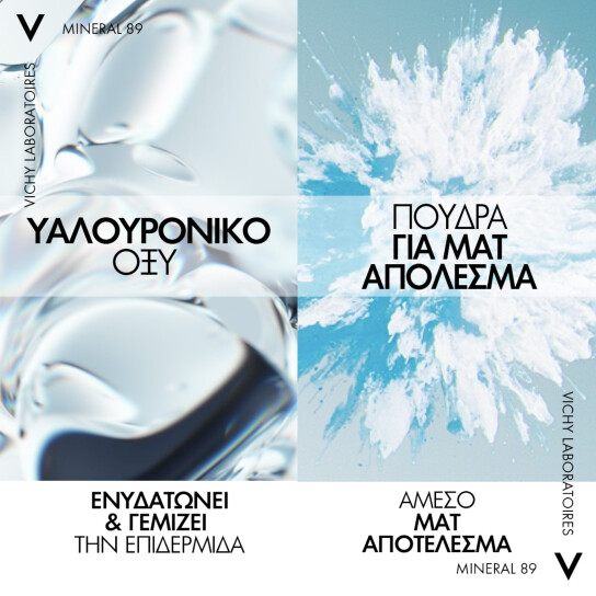 Η κρέμα - gel ενυδάτωσης Mineral 89 50ml της Vichy ενυδατώνει αποτελεσματικά την λιπαρή επιδερμίδα, προσφέροντας άμεσο ματ αποτέλεσμα. Η υφή είναι ανάλαφρη και δροσερή σαν σορμπέ. Ο ενυδατικός φραγμός της επιδερμίδας αποδυναμώνεται από την έκθεση στους καθημερινούς επιθετικούς παράγοντες. Η λιπαρή επιδερμίδα αντιδρά, παράγοντας περίσσεια σμήγματος. Αυτή η κρέμα- gel που μεταμορφώνεται σε ματ υφή, δροσερή όπως ένα σορμπέ, συγκεντρώνει απαραίτητα συστατικά για την επιδερμίδα [Καθαρό Υαλουρονικό Οξύ + Μεταλλικά Στοιχεία + Βιταμίνη Β3] σε συνδυασμό με Σαλικυλικό Οξύ και Ματ Πούδρες. Κλειδώνει την ενυδάτωση για έως και 48 ώρες και μειώνει ορατά την περίσσεια σμήγματος. Η επιδερμιδα αποκτά άμεσα ματ όψη και οι πόροι ελαχιστοποιούνται.