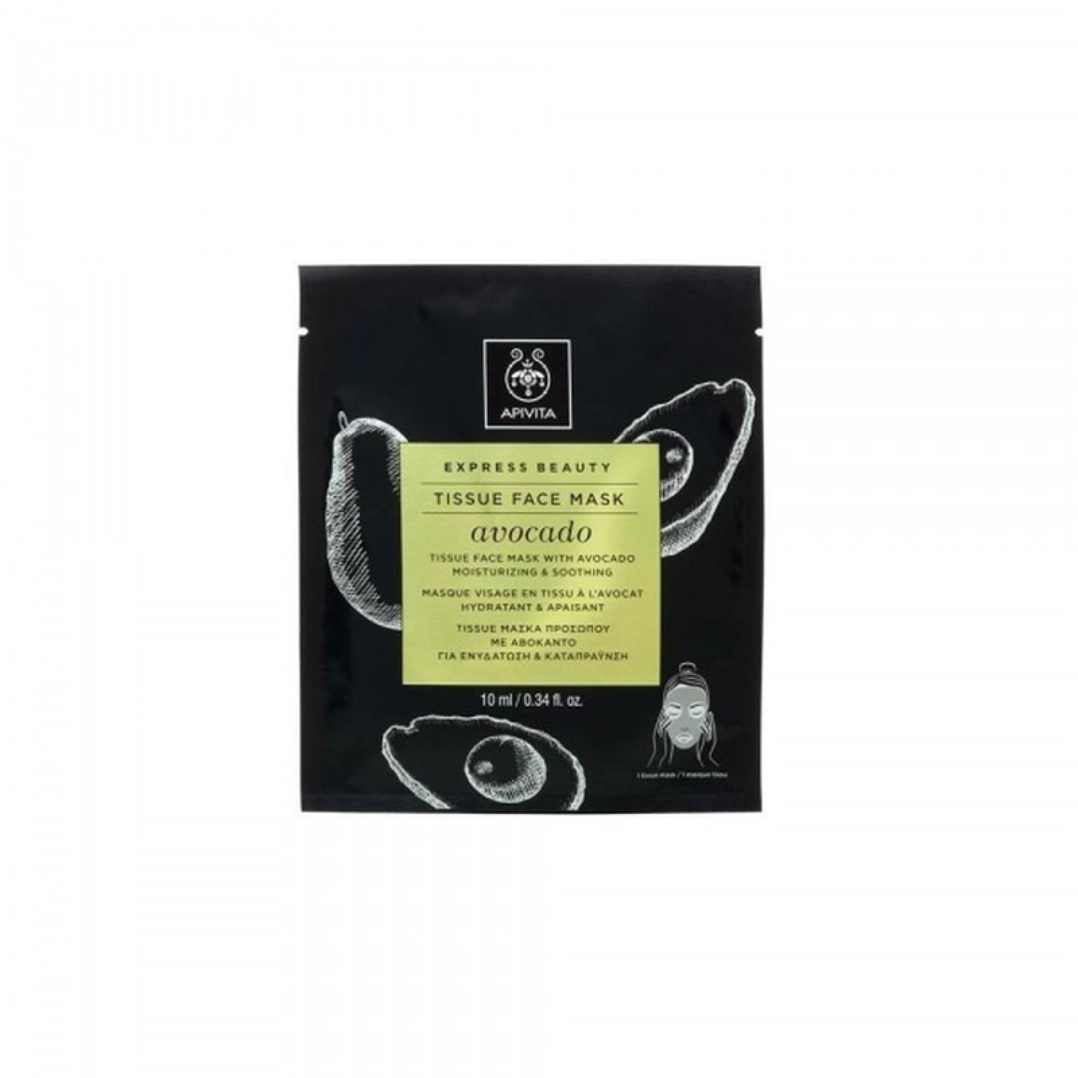Η Express Beauty Tissue Face Mask Avocado της Apivita, με αβοκάντο, είναι μια ημιδιάφανη υφασμάτινη βιο-κυτταρική μάσκα προσώπου με ίνες φυσικής κυτταρίνης από καρύδα.