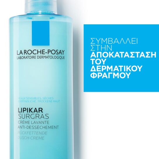 Συμπυκνωμένη κρέμα για ντους Lipikar Surgras 400ml που αναπληρώνει τα λιπίδια του δέρματος Κατά της ξηρότητας. Xωρίς σαπούνι kai paraben. Βοηθά στην αποκατάσταση του επιδερμικού φραγμού.